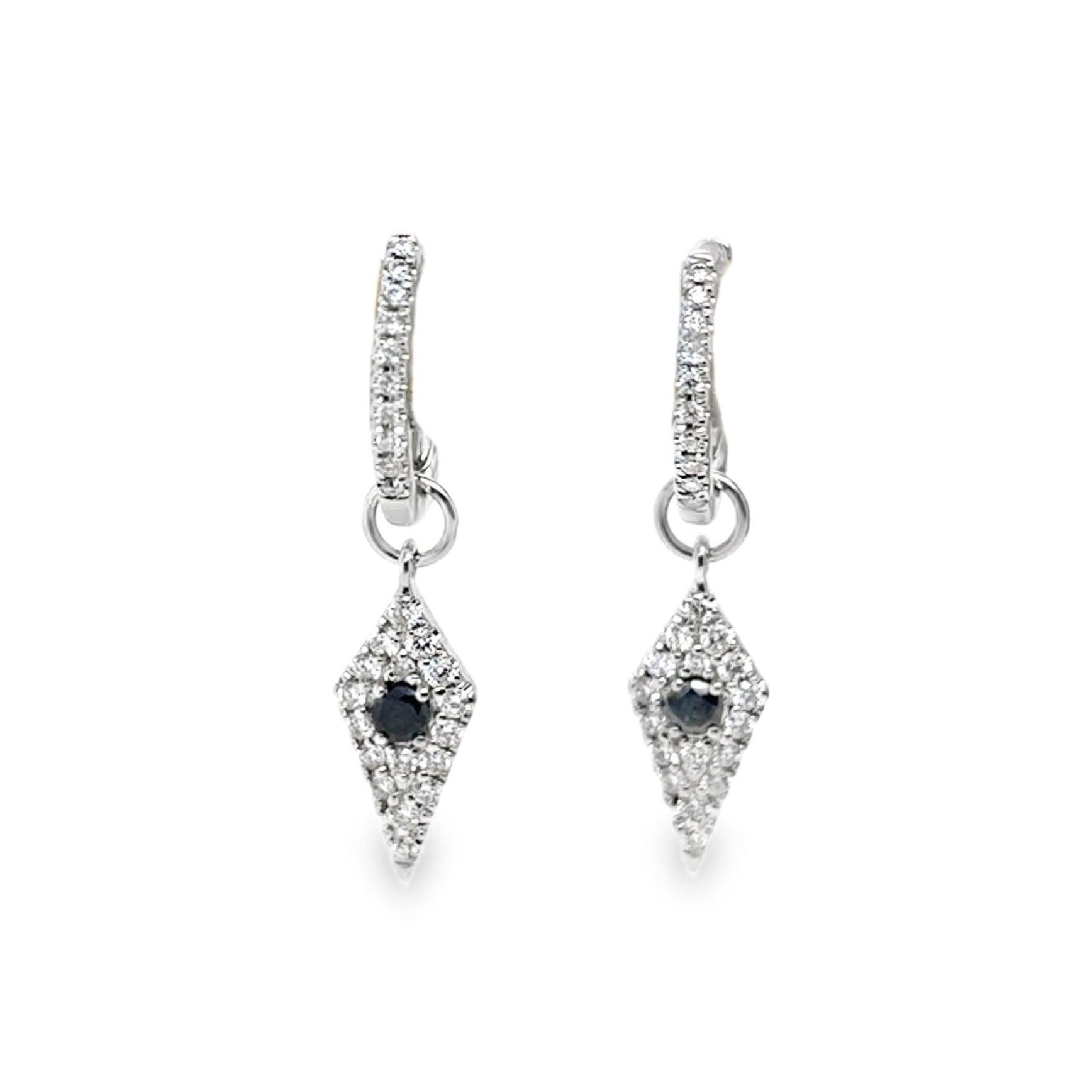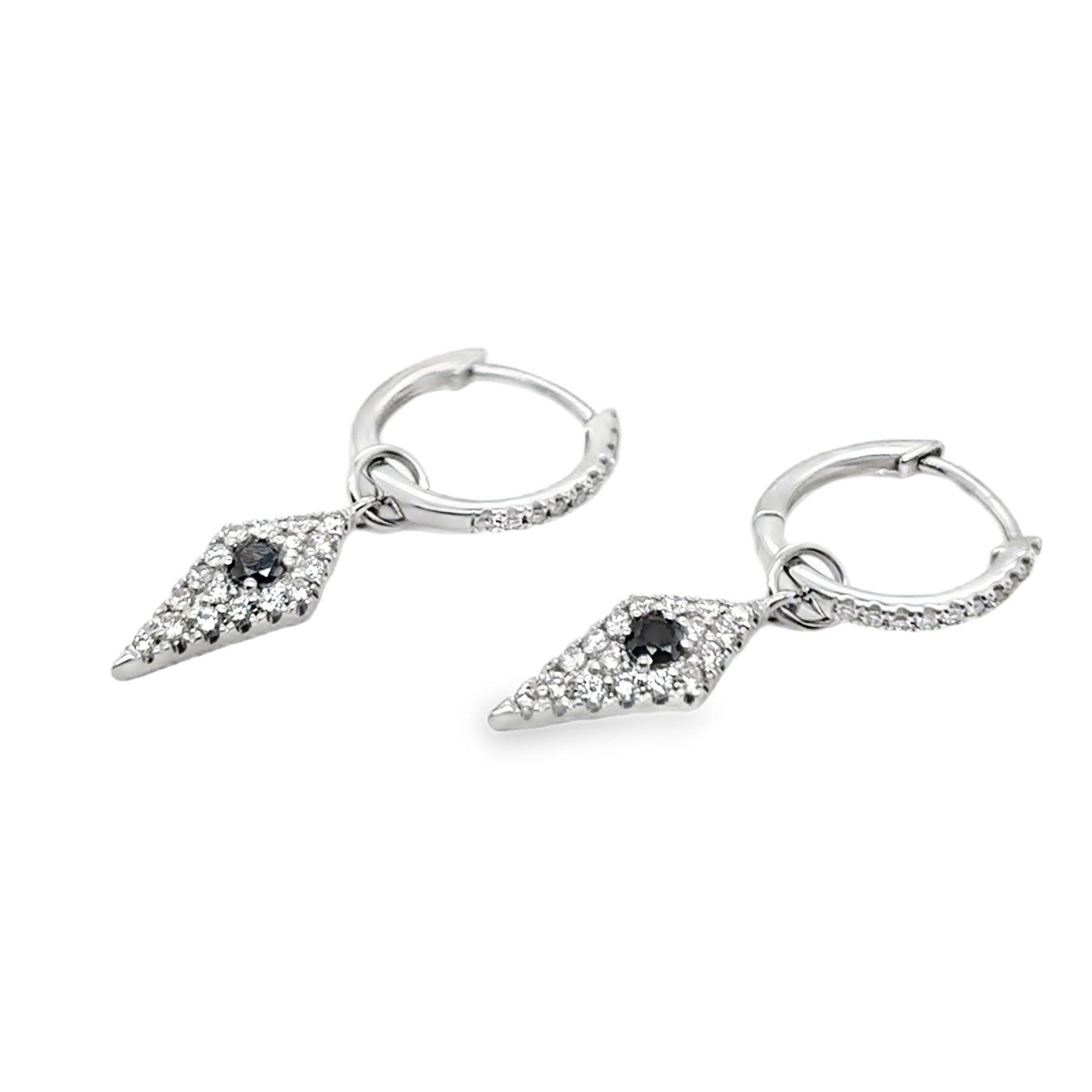 Elevate your jewelry collection with this expertly crafted 18K white gold huggie hoop earring, featuring a striking kite-shaped charm adorned with 0.10 carats of black diamonds and 0.29 carats of white diamonds. The contrasting diamonds create a sophisticated balance of boldness and brilliance, perfect for adding a refined touch to any ensemble. Designed for comfort and style, this piece offers lasting elegance suitable for both everyday wear and special occasions.