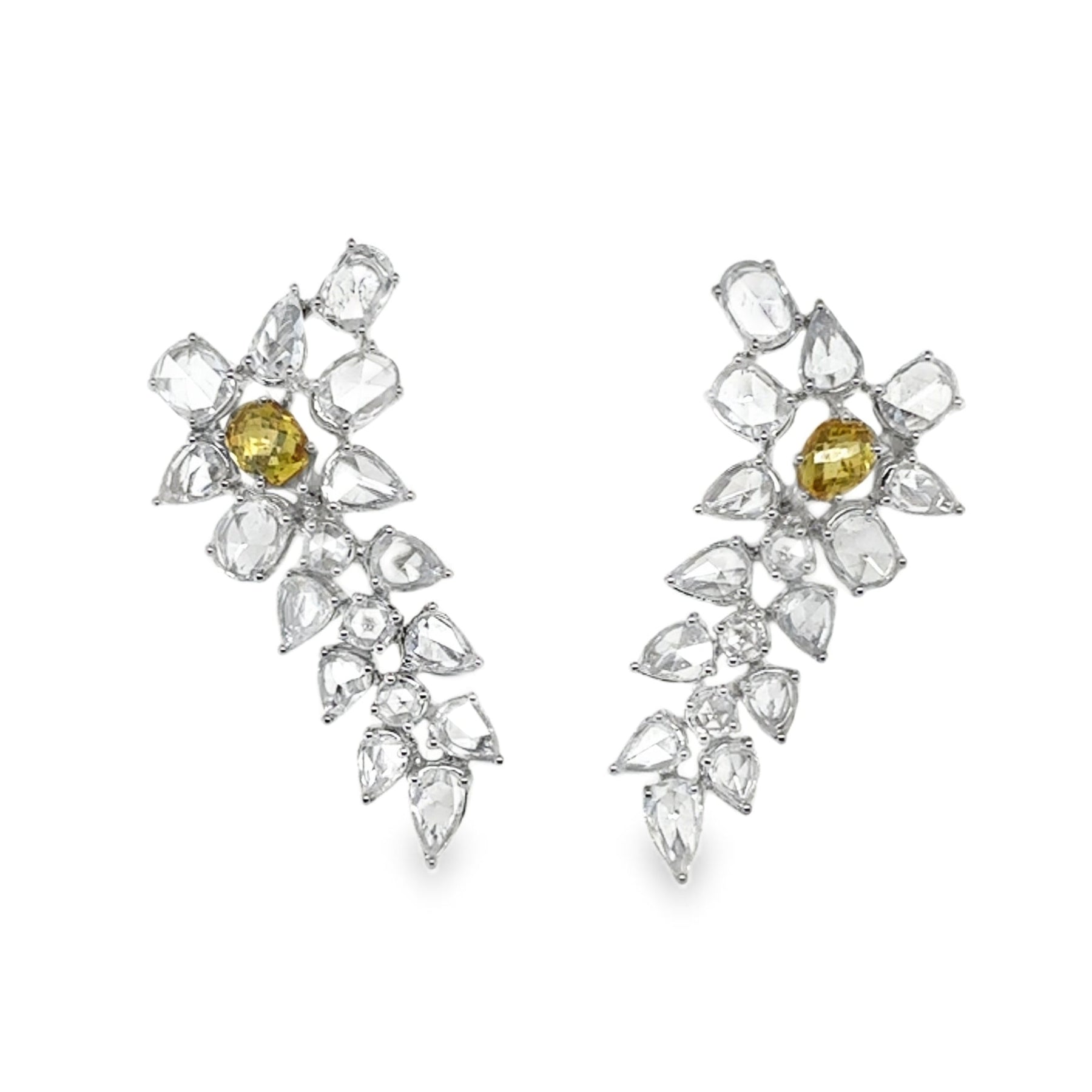 These 18K white gold earrings feature a total of 2.97 carats of fancy yellow and rose-cut diamonds, expertly set to create a sophisticated ear crawler design. The screw-back closure ensures a secure and comfortable fit, making them an elegant choice for those seeking a unique blend of classic craftsmanship and contemporary style.